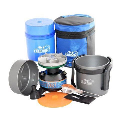 Портативный набор для приготовления пищи в походных условиях. Горелка представляет собой усовершенствованный примус, с защитой от задувания ветром, регулятором подачи топлива. Объем топливного бака 410 мм. Кроме горелки, в состав набора входит герметичный футляр для горелки, кастрюля со складными ручками объемом 1 литр, сковорода со складной ручкой, ложка-вилка и чехол для транспортировки набора.