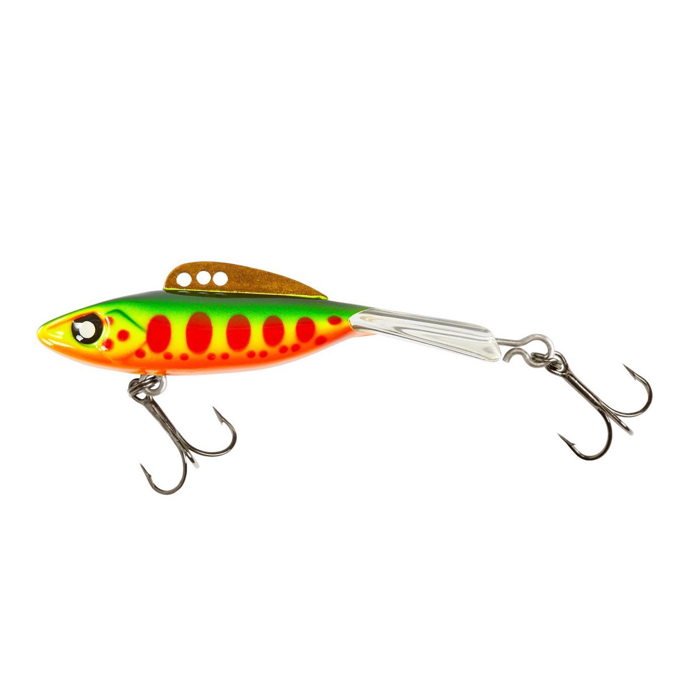 Балансир разработанный в Японии, для ловли хищной рыбы со льда и в отвес с дрейфующей лодки. Приманка изготовлена из свинцового сплава с корпусом и хвостом, сформированными из цельного морозостойкого и ударопрочного пластика ABS. Длинный хвост обеспечивает четкие развороты приманки в крайних точках траектории движения. В спинном плавнике, изготовленном из латуни, имеется три отверстия. В зависимости от точки крепления, игра приманки изменяется. На приманке установлены крючки Owner. Рекомендуется для ловли судака, щуки, форели и окуня.