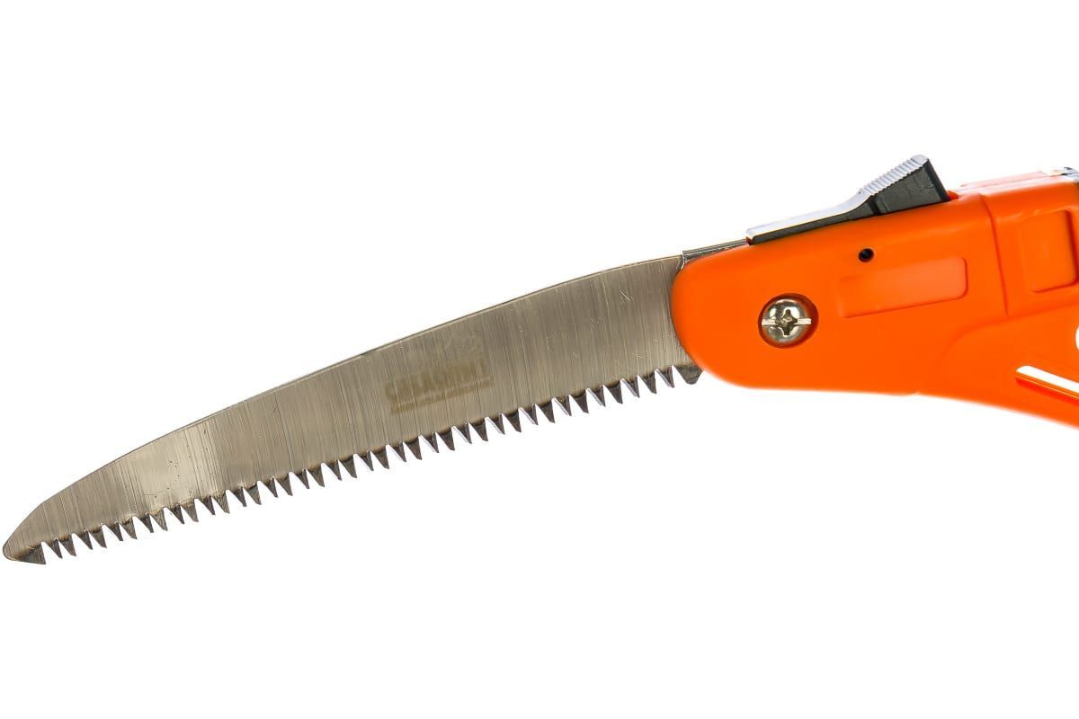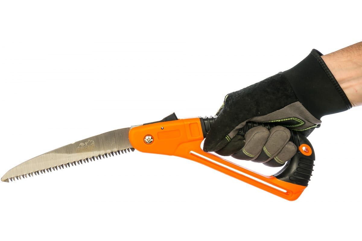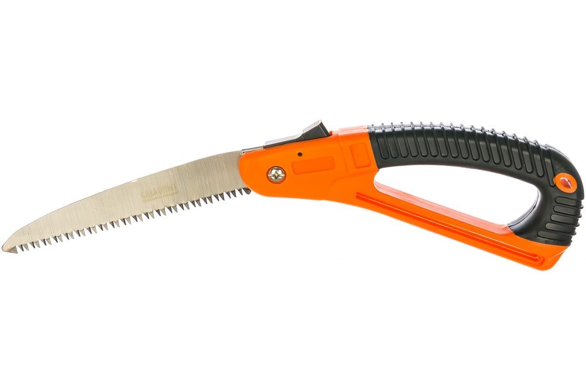 Складная туристическая пила - необходимый инструмент для туристов и охотников, также подойдёт и садоводам. Подходитодходит для распила веток,сучьев и небольших бревен.Лезвие длиной 20 см выполнено из прочной нержавеющей стали и имеет высококачественную трехгранную заточку, что обеспечивает быстрый распил древесины и исключает затупление лезвия. Кнопочный фиксатор надежно закрепляет лезвие в крайних положениях.Рукоятка с обрезиненным захватом не скользит в руке, что способствует комфортной и безопасной работе.