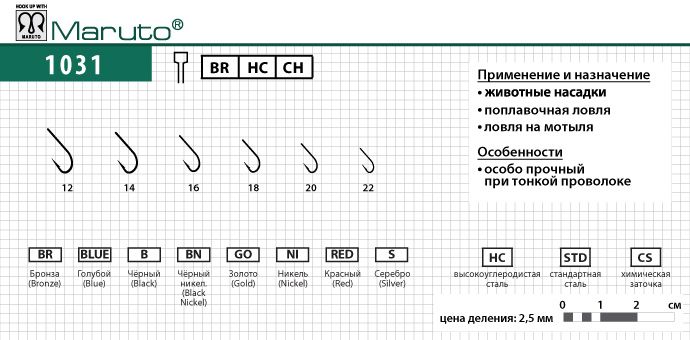Мы продаем только «белый», официальный товар (РСТ). Гарантия на товар: Крючки Maruto 1031 BR №16 (10 шт.) универсал предоставляется его изготовителем. Гарантийные сроки устанавливаются изготовителем товара. Гарантийное обслуживание осуществляется авторизованными изготовителем сервисными центрами на установленных изготовителем условиях. Обращаем внимание на то, что некоторые товары ремонтируются по серийному номеру или на основании документов, подтверждающих факт покупки товара. В этом случае гарантийный талон не предусмотрен. Какие товары подлежат к этой категории, можно уточнить у наших представителей или на сайтах производителей.