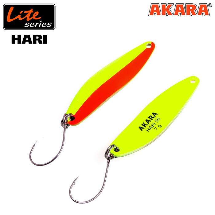 Akara Lite Series Hari 50. Блесна имеет превосходные полетные данные, позволяющие использовать ее на длинных дистанциях, что очень важно при ловле осторожной рыбы, прежде всего жереха и форели. Узкая, имитирующая малька форма блесны демонстрирует активную и устойчивую игру средней частоты. Так же, прогонистое тело приманки обеспечивает успешное применение ее на течении: при проводке на снос или против струи.