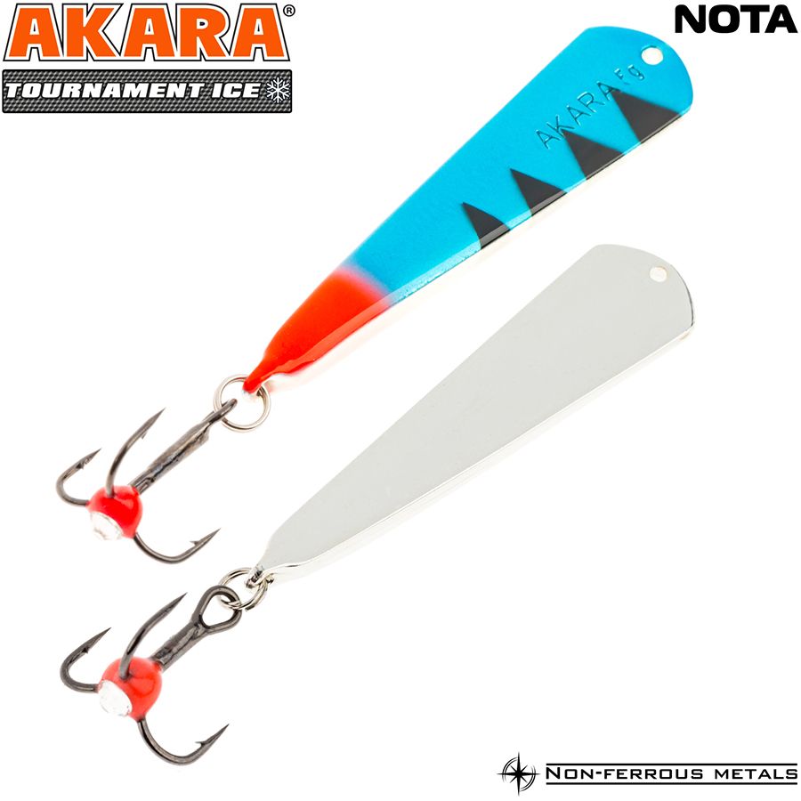 Блесна зимняя Akara Tournament Ice Nota выпускается в двух размерах 35 и 45 мм и в основном рассчитана на ловлю окуня. Отличается гвоздящей игрой и отлично работает по активной рыбе. При широких взмахах имеет отклонение в сторону, что так же привлекает рыбу.