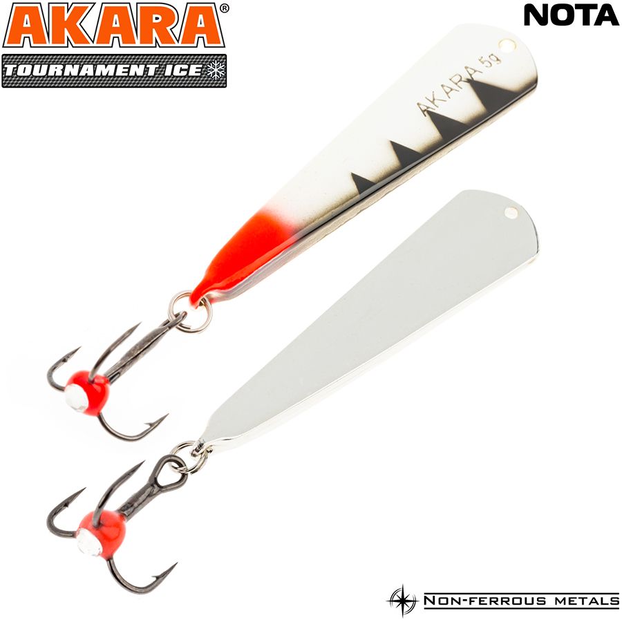 Блесна зимняя Akara Tournament Ice Nota выпускается в двух размерах 35 и 45 мм и в основном рассчитана на ловлю окуня. Отличается гвоздящей игрой и отлично работает по активной рыбе. При широких взмахах имеет отклонение в сторону, что так же привлекает рыбу.
