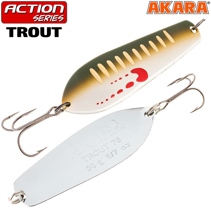 Блесна колебалка Akara Action Series Trout - классическая блесна для ловли лососевых, судака, щуки. Проверенная временем форма не стабильная размашистая игра неизменно провоцируют хищника на хватку. Широкая цветовая гамма позволяет легко подобрать нужный цвет в зависимости от степени освещенности воды. С успехом используется для ловли в заброс и троллингом.
