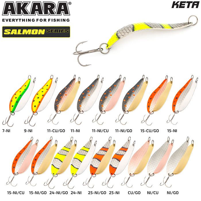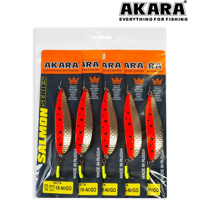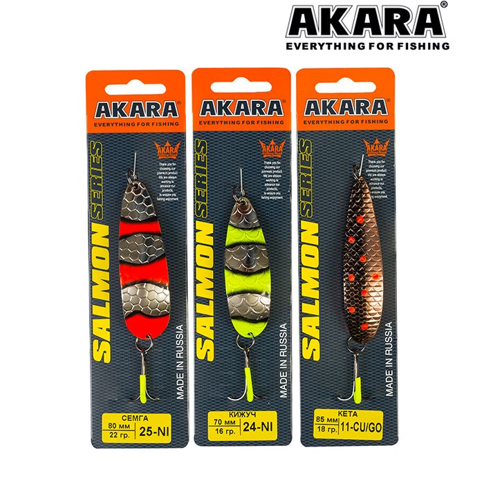 Колеблющаяся блесна Akara серии Salmon. Пожалуй, одна из лучших колебалок для ловли лососёвых пород рыб. Благодаря специально разработанной и многократно испытанной форме, великолепно провоцирует хищника на атаку. Варианты различных весов и размеров, позволяют ловить ею как на сносе течением при боковых забросах, так и в ямах, но не с сильным течением. Благодаря своей форме, блесна обладает, мелкой высокочастотной игрой, меняющейся по амплитуде, в зависимости от размера и веса, что как раз так нравится лососёвым. Щука, окунь, судак и пассивный жерех, тоже не оставят данную приманку без внимания. Из-за особенностей прямой проводки, на лёгкие веса Akara Salmon, можно успешно ловить по мелководным перекатистым речкам и травянистым озёрам.