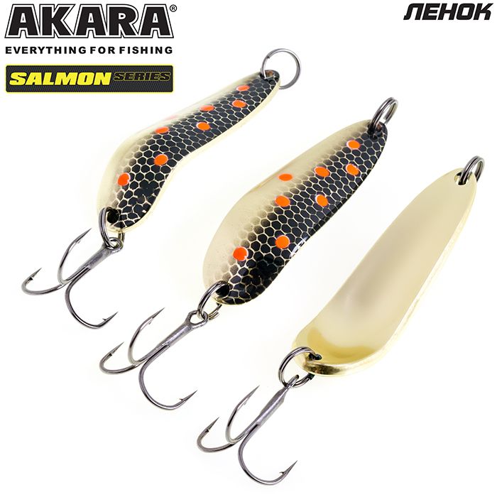 Колеблющаяся блесна Akara серии Salmon. Пожалуй, одна из лучших колебалок для ловли лососёвых пород рыб. Благодаря специально разработанной и многократно испытанной форме, великолепно провоцирует хищника на атаку. Варианты различных весов и размеров, позволяют ловить ею как на сносе течением при боковых забросах, так и в ямах, но не с сильным течением. Благодаря своей форме, блесна обладает, мелкой высокочастотной игрой, меняющейся по амплитуде, в зависимости от размера и веса, что как раз так нравится лососёвым. Щука, окунь, судак и пассивный жерех, тоже не оставят данную приманку без внимания. Из-за особенностей прямой проводки, на лёгкие веса Akara Salmon, можно успешно ловить по мелководным перекатистым речкам и травянистым озёрам.