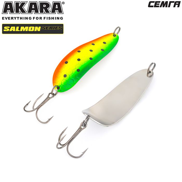Колеблющаяся блесна Akara серии Salmon. Пожалуй, одна из лучших колебалок для ловли лососёвых пород рыб. Благодаря специально разработанной и многократно испытанной форме, великолепно провоцирует хищника на атаку. Варианты различных весов и размеров, позволяют ловить ею как на сносе течением при боковых забросах, так и в ямах, но не с сильным течением. Благодаря своей форме, блесна обладает, мелкой высокочастотной игрой, меняющейся по амплитуде, в зависимости от размера и веса, что как раз так нравится лососёвым. Щука, окунь, судак и пассивный жерех, тоже не оставят данную приманку без внимания. Из-за особенностей прямой проводки, на лёгкие веса Akara Salmon, можно успешно ловить по мелководным перекатистым речкам и травянистым озёрам.