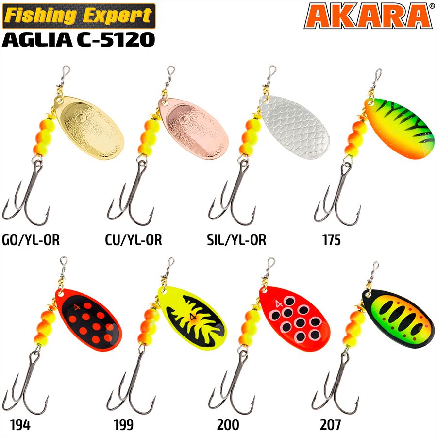 Aglia - классическая блесна от Akara. Универсальная вертушка для ловли на любом типе водоемов. Благодаря большому углу атаки лепестка есть возможность проводки на минимальных скоростях, а при ловли на струе держать блесну без подмотки, давая ей плавно съезжать перпендикулярно течению.