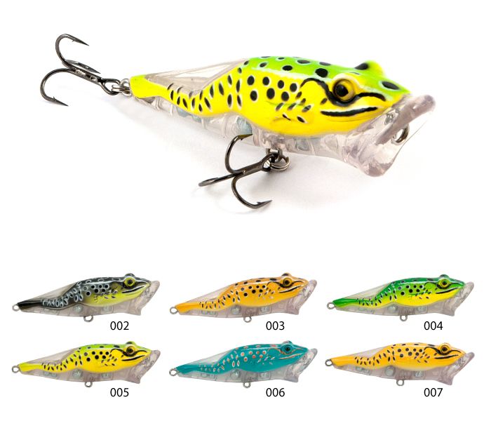 Crazy Frog – оригинальный поппер в виде лягушки с увеличенной носовой частью в форме присоски. Хорошая анимация при любых проводках и высокие аэродинамические характеристики при забросе с успехом позволяют использовать Crazy Frog рыболовам даже с небольшим опытом ловли. Присоска поппера имеет два симметричных отверстия, что делает его игру более заметной и дополнительно привлекает хищника. Акустический. Плавающий. Выпускается в размерах 80мм и 90мм.