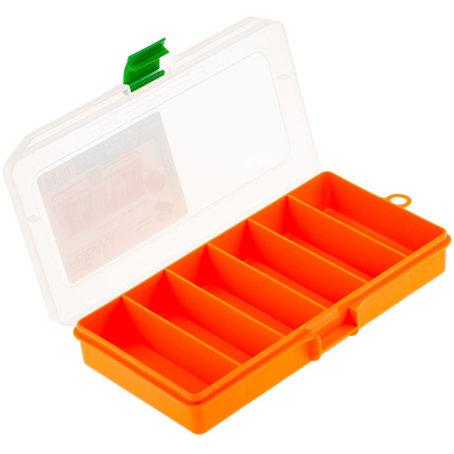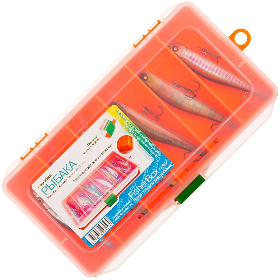 Коробка FisherBox 216 Orange это небольшая, удобная коробка с шестью отделениями. Коробка FisherBox 216 разрабатывалась для использования в разгрузочных рыболовных жилетах, поэтому можете смело положить её в карман такого жилета, при этом Вы не будете чувствовать дискомфорта даже во время активных движений. Для изготовления коробки используется прозрачный морозоустойчивый пластик, способный выдержать большие ударные нагрузки и суровую погоду. FisherBox 216 Orange оснащена стандартной сменной защёлкой для надёжного хранения содержимого. Также на крышке коробки расположены специальные треугольные отливы для большей прочности замка. Вес 160г.
