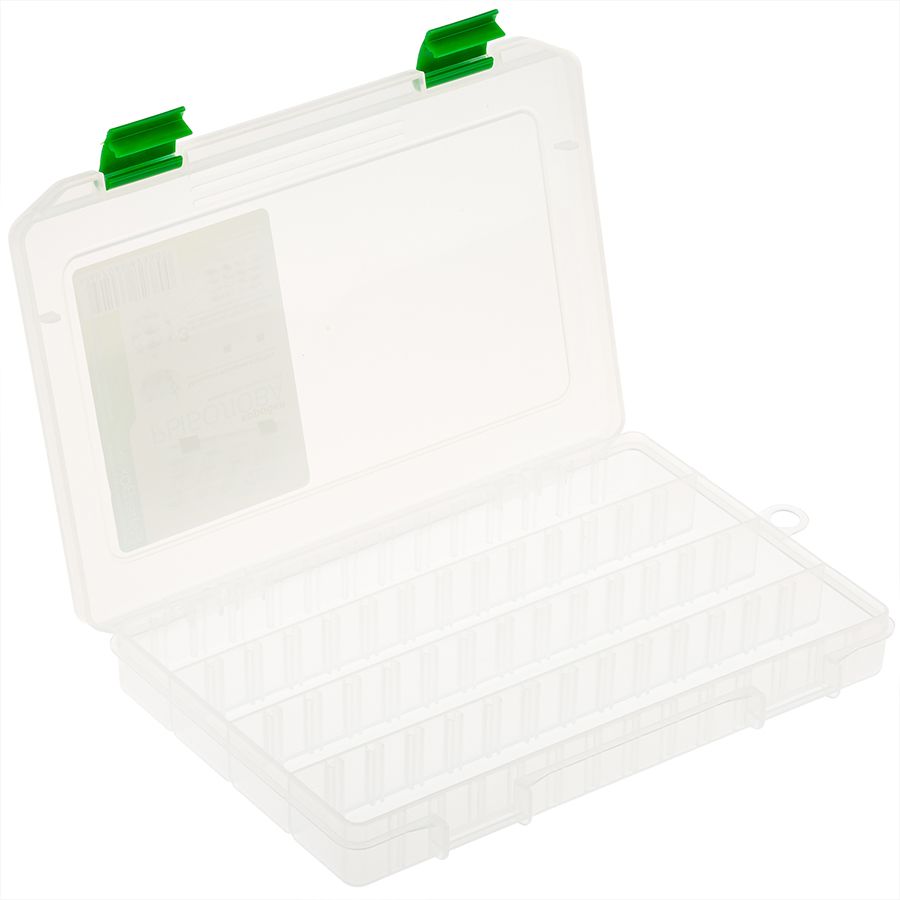 Коробка FisherBox 220 - подойдет спиннингистам, любителям поплавочной, фидерной и карповой ловли. В ней можно хранить приманки, готовые оснастки и элементы для их монтажа, различные принадлежности, без которых на рыбалке не обойтись. Модель изготовлена из прочного полимера. В органайзере можно держать силиконовые приманки. Рифленые насечки на крышке не дают пальцам соскальзывать и облегчают извлечение коробки из плотно набитой сумки. Небольшая, но вместительная коробка FisherBox 220 имеет четыре стационарных отделения, которые при необходимости можно разделить на нужное количество ячеек. Для этого модель комплектуется съемными перегородками. Направляющие надежно удерживают разделители и легко снимаются для того, чтобы можно было навести в коробке порядок или изменить размеры ячеек. Кейс закрывается с помощью двух полипропиленовых защелок.