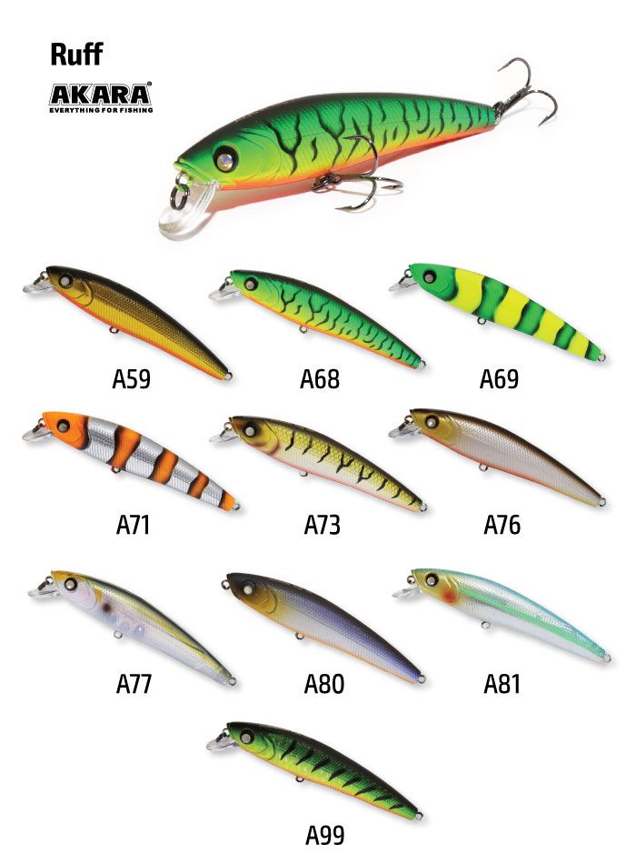 Воблер Akara Ruff (переводится как ёрш) – новый воблер для твичинга производства компании Akara. Воблер имеет длину 90 миллиметров и вес 10 грамм и предназначен в первую очередь для ловли щуки но, как показала практика, на этот воблер также охотно клюёт окунь. Воблер плавающий, благодаря чему может использоваться для лова на небольших глубинах, имеет оригинальную игру и при проводке может заглубляться до 1,5 метров. Для дополнительного привлечения внимания хищника Ruff оснащается шумовой камерой, а система стабилизации помогает сделать заброс более дальним и точным. Плавающий. Кастинг 0 до 1,0 м.
