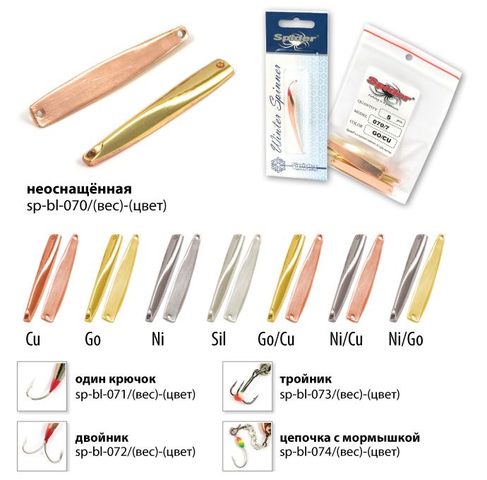Коллекция зимних блёсен для вертикального блеснения от Spider, прошла многолетнюю селекцию и представляет все самое лучшее, что было создано из блесен для зимней рыбалки на данный момент. Все блёсна цельнометаллические, изготовленные методом холодной ковки из латуни. Благодаря новым технологиям производства удалось добиться максимально реалистичной и стабильной игры приманки, на рыболовном сленге это называется «блесна звенит». Проверенные временем классические модели, а так же уловистые новинки позволяют рыболову каждый раз добиваться успеха на рыбалке.