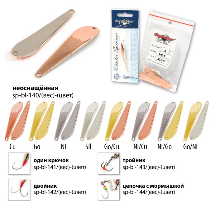 Коллекция зимних блёсен для вертикального блеснения от Spider, прошла многолетнюю селекцию и представляет все самое лучшее, что было создано из блесен для зимней рыбалки на данный момент. Все блёсна цельнометаллические, изготовленные методом холодной ковки из латуни. Благодаря новым технологиям производства удалось добиться максимально реалистичной и стабильной игры приманки, на рыболовном сленге это называется «блесна звенит». Проверенные временем классические модели, а так же уловистые новинки позволяют рыболову каждый раз добиваться успеха на рыбалке.