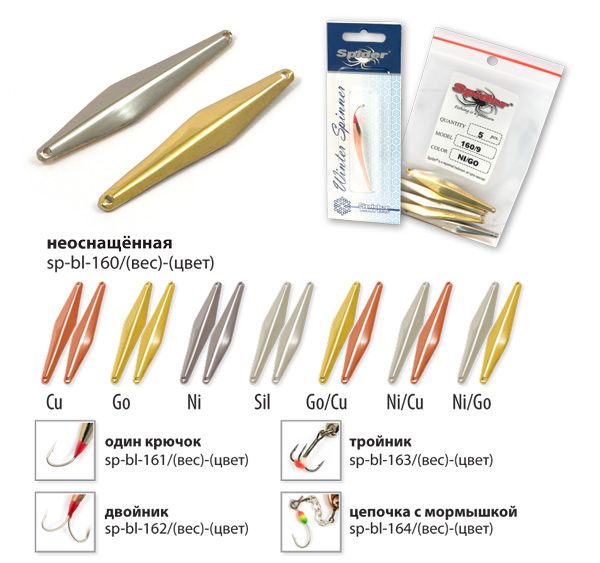 Коллекция зимних блёсен для вертикального блеснения от Spider, прошла многолетнюю селекцию и представляет все самое лучшее, что было создано из блесен для зимней рыбалки на данный момент. Все блёсна цельнометаллические, изготовленные методом холодной ковки из латуни. Благодаря новым технологиям производства удалось добиться максимально реалистичной и стабильной игры приманки, на рыболовном сленге это называется «блесна звенит». Проверенные временем классические модели, а так же уловистые новинки позволяют рыболову каждый раз добиваться успеха на рыбалке.