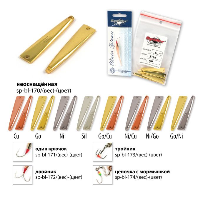 Коллекция зимних блёсен для вертикального блеснения от Spider, прошла многолетнюю селекцию и представляет все самое лучшее, что было создано из блесен для зимней рыбалки на данный момент. Все блёсна цельнометаллические, изготовленные методом холодной ковки из латуни. Благодаря новым технологиям производства удалось добиться максимально реалистичной и стабильной игры приманки, на рыболовном сленге это называется «блесна звенит». Проверенные временем классические модели, а так же уловистые новинки позволяют рыболову каждый раз добиваться успеха на рыбалке.