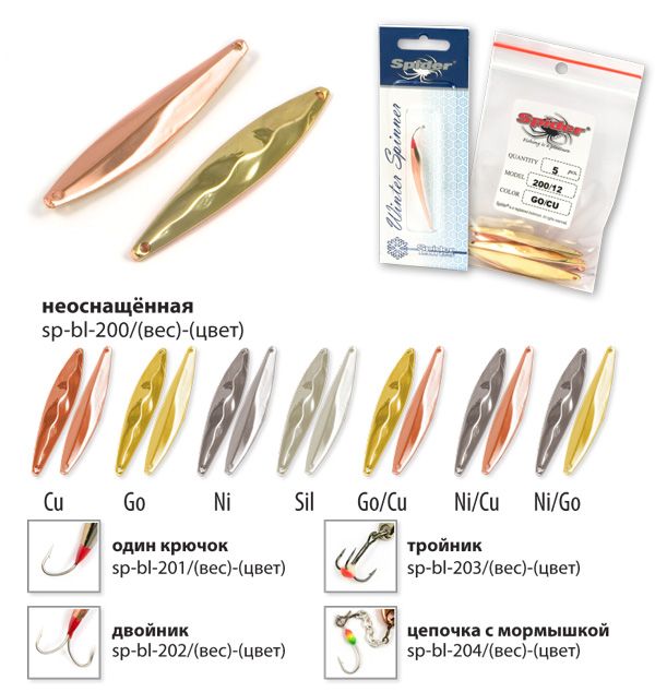 Коллекция зимних блёсен для вертикального блеснения от Spider, прошла многолетнюю селекцию и представляет все самое лучшее, что было создано из блесен для зимней рыбалки на данный момент. Все блёсна цельнометаллические, изготовленные методом холодной ковки из латуни. Благодаря новым технологиям производства удалось добиться максимально реалистичной и стабильной игры приманки, на рыболовном сленге это называется «блесна звенит». Проверенные временем классические модели, а так же уловистые новинки позволяют рыболову каждый раз добиваться успеха на рыбалке.