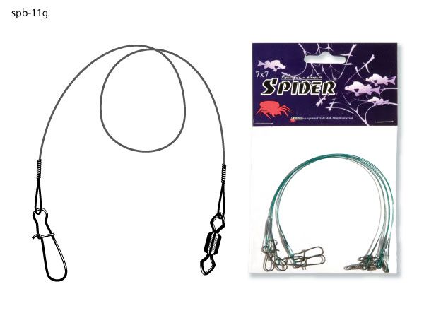 Материал для поводков Spider свит из тончайшей проволоки, выполненной из нержавеющей стали. Поводок оснащен самозатягивающейся застежкой и качественным вертлюжком. Поводок выпускается в нескольких сериях: 1x7 - (7 сплетенных нитей) – серия отличается наибольшей жесткостью, что позволяет лучше чувствовать приманку на дальних дистанциях заброса. 7x7 - (49 сплетенных нитей) – серия имеет повышенную эластичность за счет уменьшения поперечного сечения используемой нити, что позволяет приманке совершать более естественные движения в воде. Серии выпускаются в трех цветах (коричневый, серебристый, зеленый), имеют различные тесты и длину.