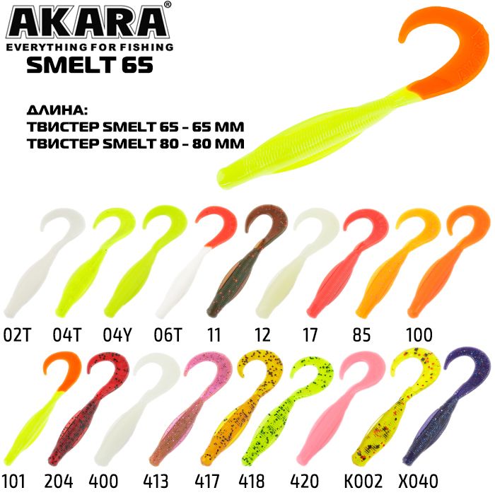 Akara Smelt - оригинальный твистер с боковыми крыльями, которые придают ему хорошую устойчивость при проводке, особенно при применении поводковых оснасток. Выпускается в размерах 65 и 80 мм.