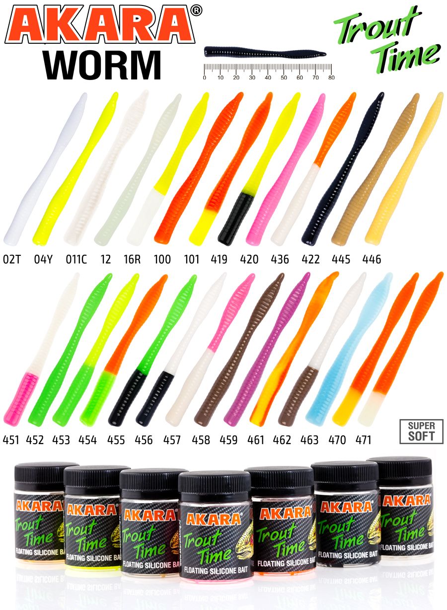 Akara Trout Time WORM 3 - форелевая силиконовая приманка в виде червя-слага. Благодаря своему рифленому телу, активно распространяет запах ароматизатора в воде, что дополнительно привлекает рыбу. Рекомендуется использовать с джиг-головками или одинарными крючками. Высокое качество материалов и грамотно подобранные ароматы позволяют этой приманке оставаться уловистой даже тогда, когда другие приманки перестают работать. Широкая цветовая гамма позволит подобрать оптимальную приманку под любые условия ловли.