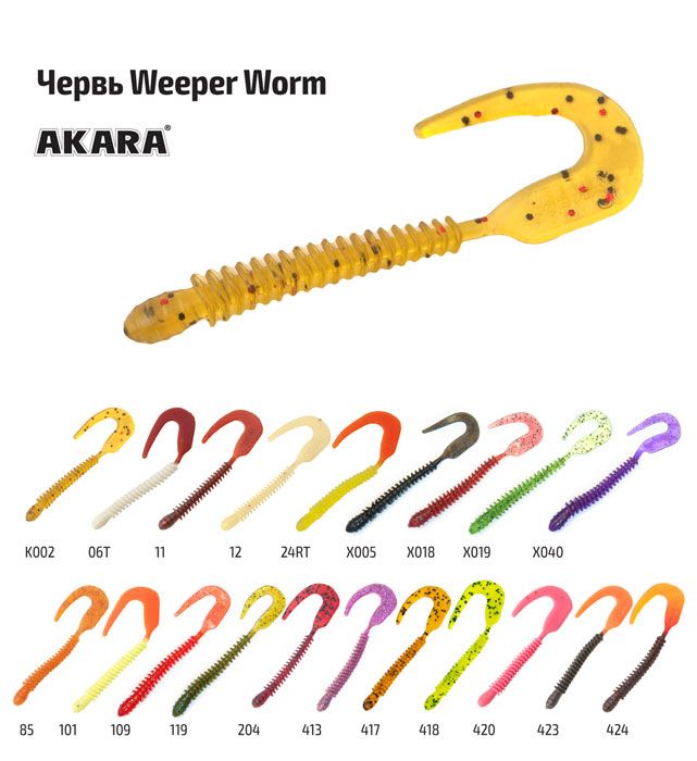 Akara Weeper Worm - ребристый червь с твистерным хвостом. Выпускается в размерах 80 и 110 мм. Обладает ярко выраженной игрой на любой скорости проводки. Ребристое тело приманки создает дополнительные колебания в воде. Используется, прежде всего, при ловле судака и окуня. Хорошо подходит для монтажа с отводным поводком и Техасской оснасткой. Размер: 80, 110 мм.
